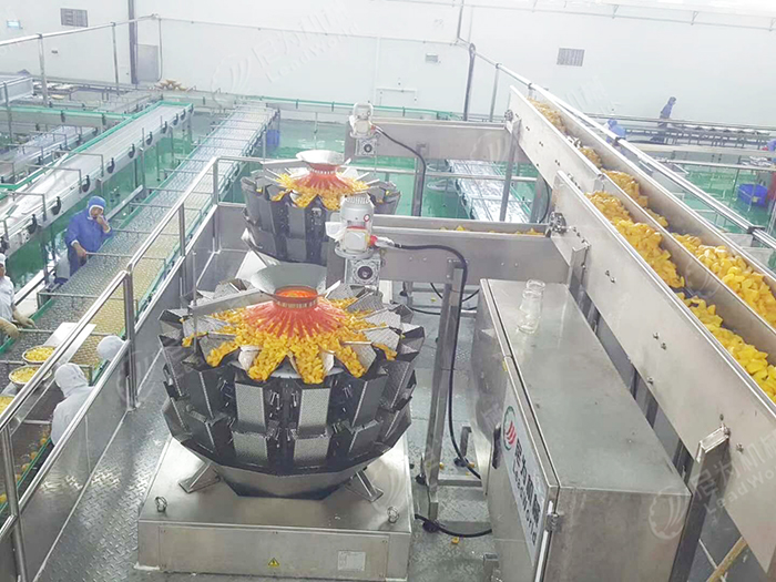 (2)按主機(jī)能力配置不同規(guī)模的連續(xù)化生產(chǎn)線。故蘿生產(chǎn)線視四道機(jī)(去皮、切端、通芯、括肉)的能力80個/min機(jī)分級規(guī)格進(jìn)行配置。桃子生產(chǎn)線視桃瓣挖核機(jī)的能力70~80個/min及分級規(guī)格進(jìn)行配置?;鹜壬a(chǎn)線能力750kg、1000kg、1500kg、2000kg進(jìn)行配置。