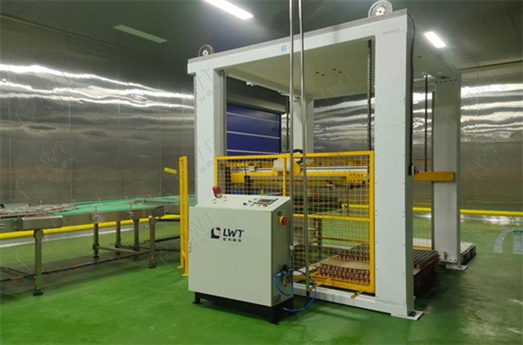 此過程中,由于沒有先進(jìn)的設(shè)備,大部分廠家只能雇用大量的人工來完成實(shí)罐的碼垛、薄膜纏繞、卸跺作業(yè)。有的廠家甚至采取不可思議的辦法:先將罐頭人工裝入周轉(zhuǎn)紙箱,然后將紙箱堆疊到托盤上,送至保溫庫存放;然后人工卸下堆垛,取出罐頭,打檢噴碼,后再一次裝箱出庫。這不僅增加生產(chǎn)成本,也影響生產(chǎn)速度,罐型越小問題越突出。